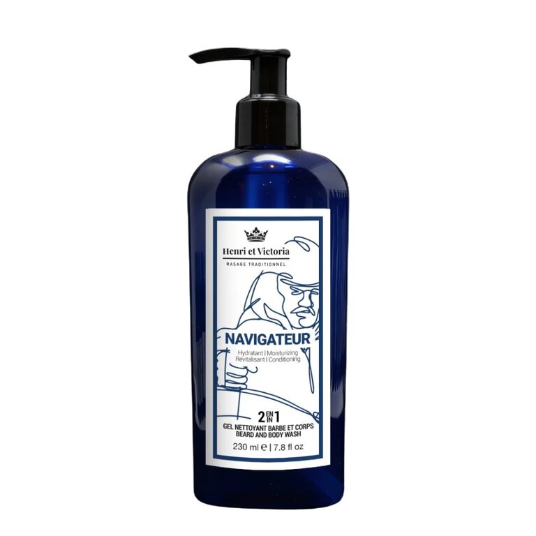 Le gel nettoyant 2 en 1 "Navigateur" de Henri et Victoria s'utilise sur la barbe, le corps et les cheveux. Ce gel hydratant et revitalisant est efficace pour l'homme qui aime nettoyer tout en même temps. Son parfum frais aux notes de citron, océan et verdure vous plaira assurément.