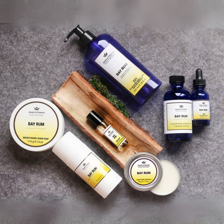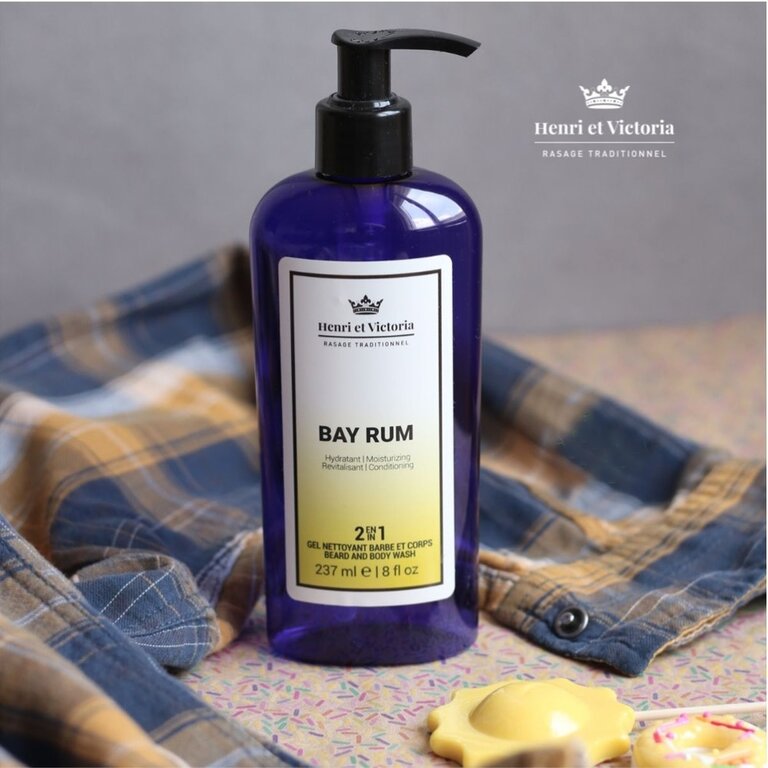 Le gel nettoyant 2 en 1 "Bay Rum" d'Henri et Victoria s'utilise sur la barbe, le corps et les cheveux. Ce nettoyant pour le corps et la barbe procure un double lavage corporel et peut même fonctionner comme shampoing.