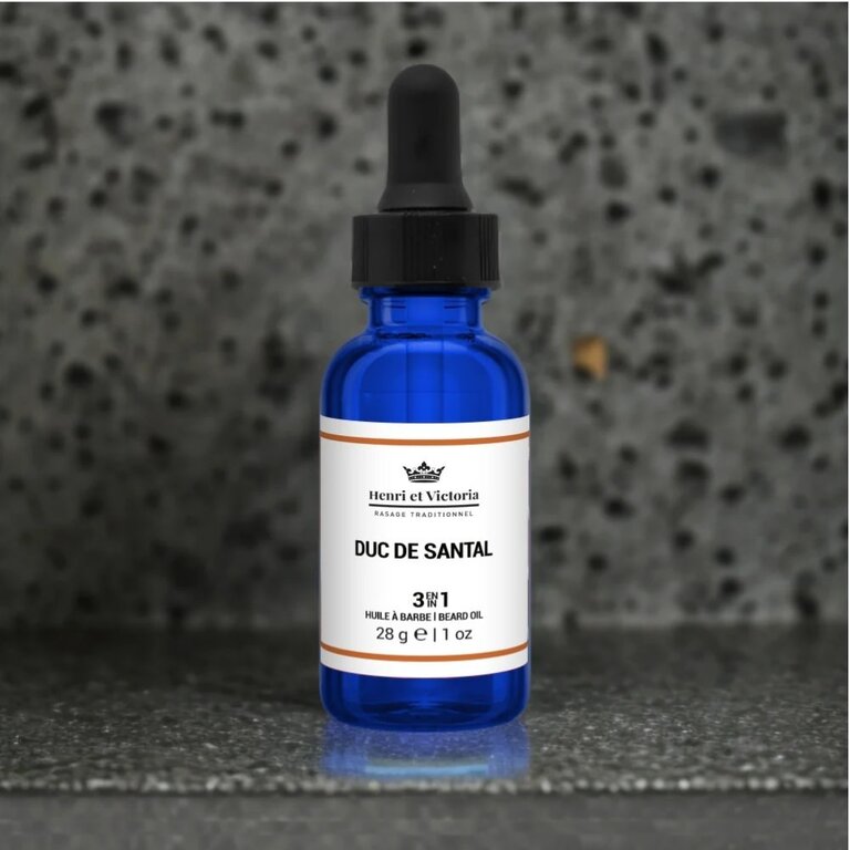 L'huile à barbe Duc de Santal d'Henri et Victoria, est un produit essentiel pour le barbu qui souhaite que sa barbe reste hydratée, saine et lisse. L'huile à barbe s'utilise quotidiennement eti fonctionne encore mieux lorsqu'elle est combinée à un baume à barbe. Ajoutez de la brillance, de la vitalité et restaurez l'humidité là où vous en avez le plus besoin.