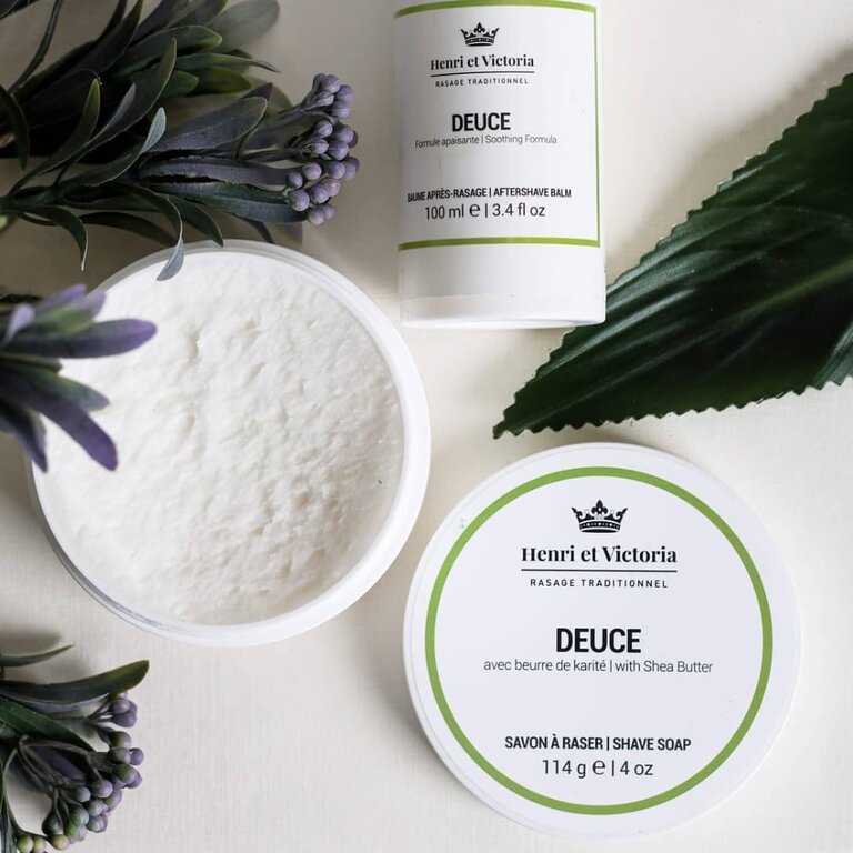 Le savon à raser "Deuce" d'Henri et Victoria, un indispensable du toilettage traditionnel pour chaque homme qui savoure le plaisir d’un rasage humide classique.