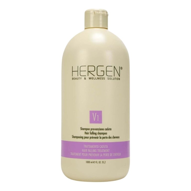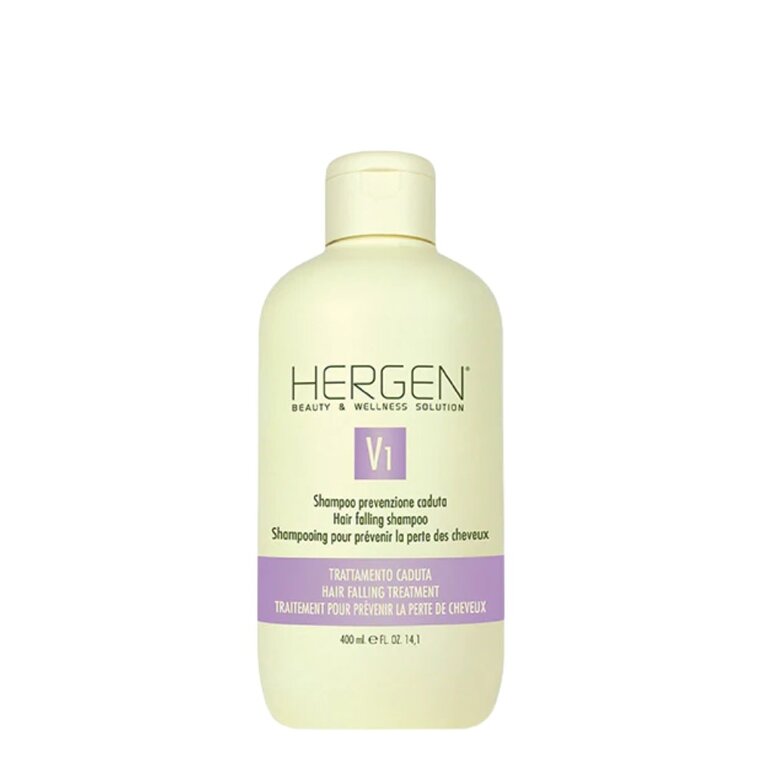 Le shampoing traitant anti-chute "V1 Hair Falling Shampoo" Hergen prolonge la durée de vie des cheveux et retarde leur chute en stimulant la prolifération des cellules folliculaires, pour une densité capillaire améliorée.