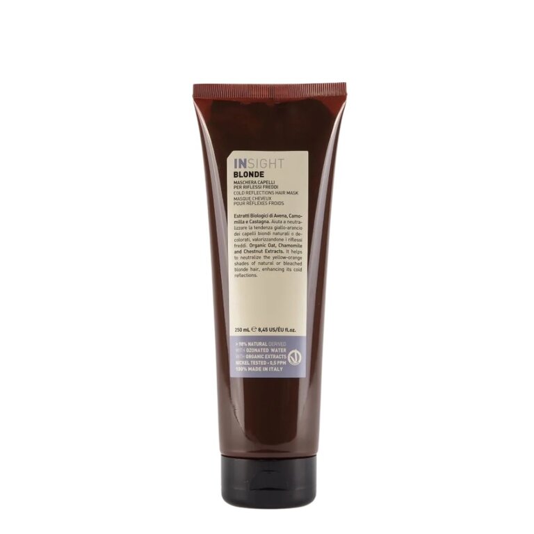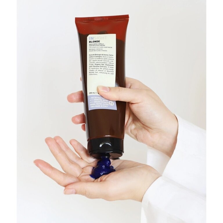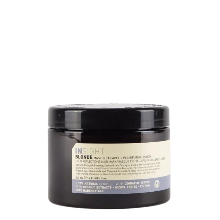 Sublimez vos cheveux blonds avec le masque pour reflets froids "Cold Reflections Mask" d'Insight. Qu'ils soient naturels, colorés ou décolorés, ce masque est formulé pour corriger et magnifier votre chevelure. Il agit en profondeur pour neutraliser les tons chauds indésirables et apporter une nutrition intense à la fibre capillaire. Grâce à l'extrait de châtaigne biologique, vos cheveux retrouveront une hydratation optimale, une souplesse remarquable et une douceur soyeuse, pour un blond pur et une brillance intensifiée.