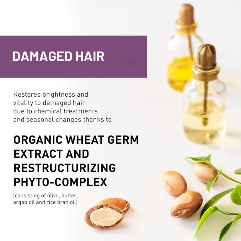 - Extrait de blé biologique, beurre d'olive et huile d'argan : Ce mélange d'actifs offre une action profonde. Il confère de puissantes propriétés réparatrices, hydratantes et nourrissantes, ce qui le rend particulièrement bénéfique pour les cheveux abîmés, affaiblis et fragilisés.
