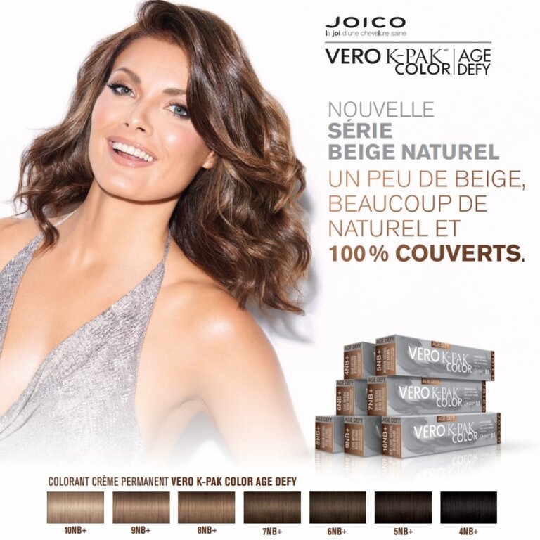 La coloration permanente "Vero K-PAK Age Defy" de Joico rétablis l'allure et la sensation jeunes des cheveux. C'est le premier colorant éprouvé pour renverser les quatre signes principaux de cheveux vieillissants. Elle offre la plus grande sélection de nuances de couverture du gris sur le marché. Elle adoucit et lisse la surface des cheveux tout en ravivant leur système hydratant interne pour rétablir une texture, un lustre et une maniabilité d’allure jeune.