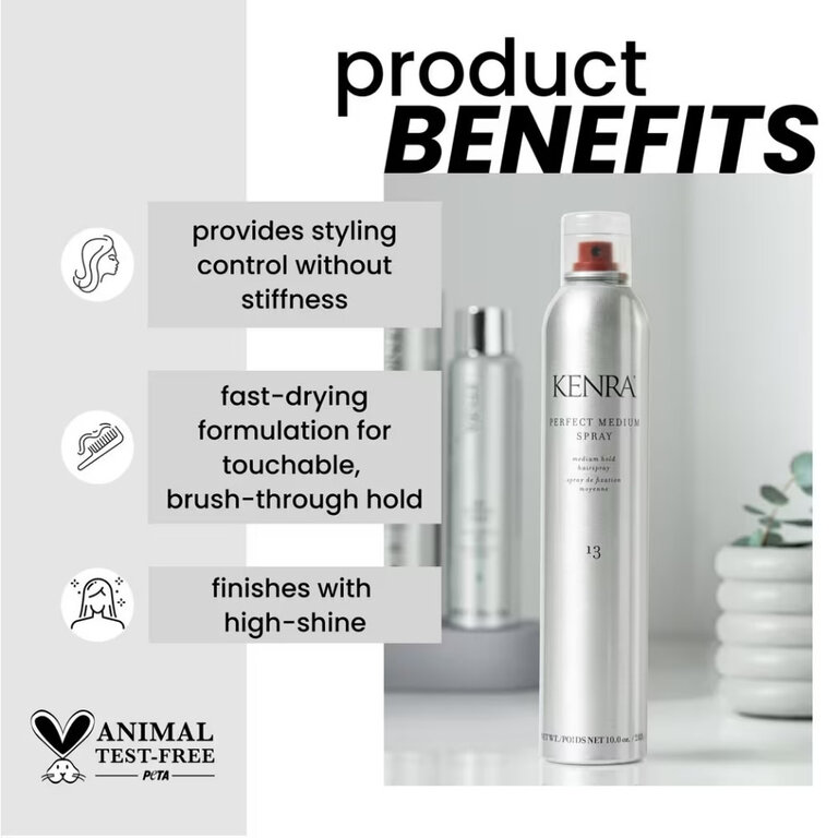 Obtenez une tenue moyenne sur mesure ainsi qu'un aspect souple et naturel grâce au fixatif de finition "Perfect Medium Spray 13" de Kenra Professional. Sa formule professionnelle à séchage rapide assure une définition améliorée et un fini souple qui tient toute la journée. De plus, ce spray ajoute instantanément du volume et de l'éclat à la chevelure. Enfin, grâce à sa composition non asséchante qui contribue à préserver la couleur, le produit s'élimine facilement d'un simple coup de brosse, sans laisser de résidus collants.