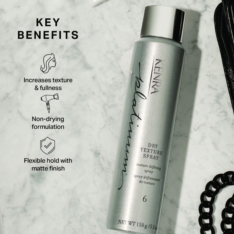 Le spray texturisant sec "Platinum Dry Texture Spray 6" de Kenra Professional augmente la texture et le corps tout en absorbant les huiles et les impuretés. Sa formule ultra-légère et non desséchante offre une tenue flexible avec un fini mat.
