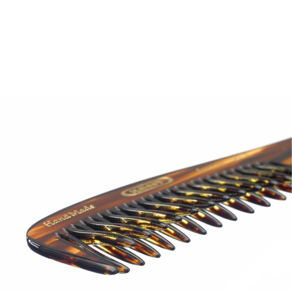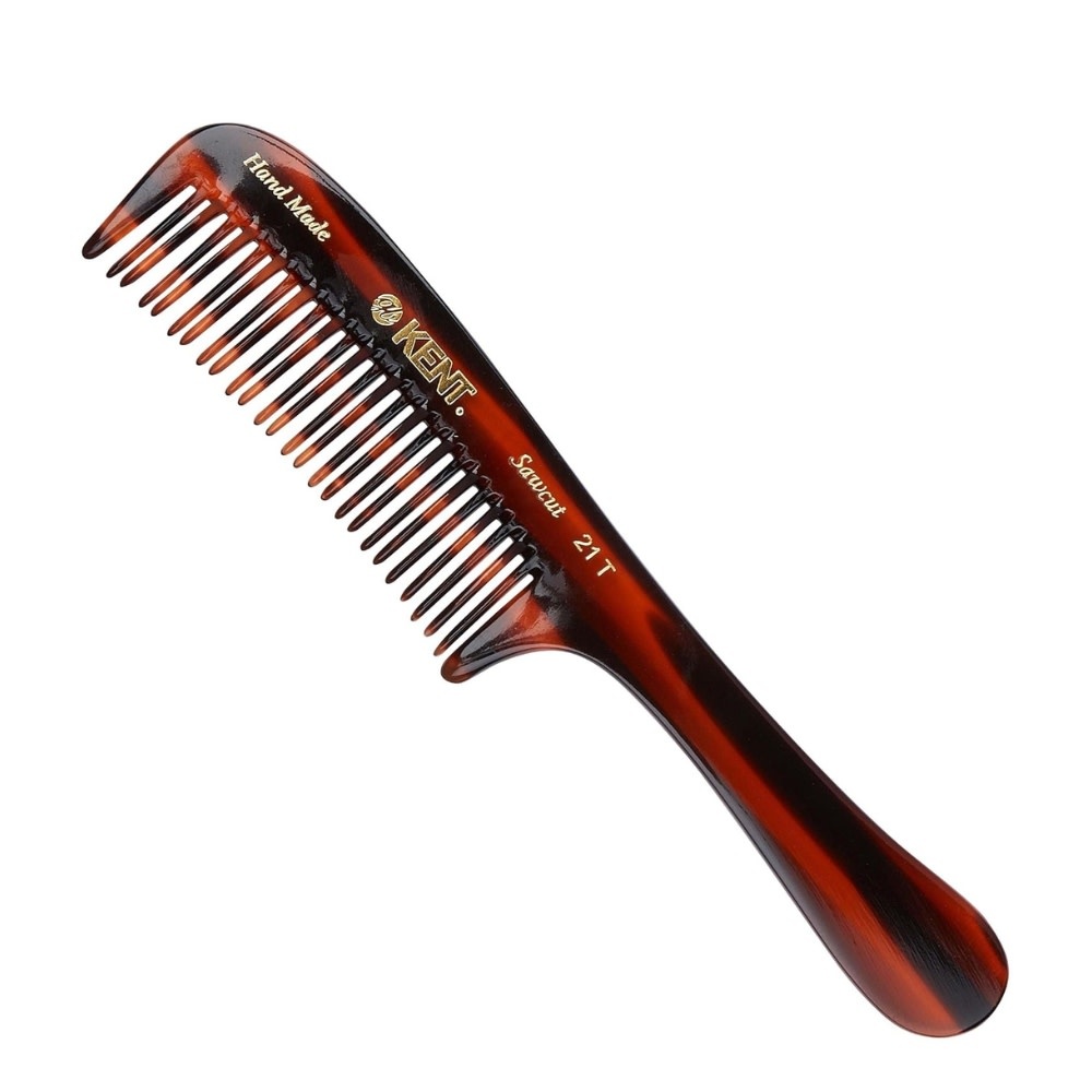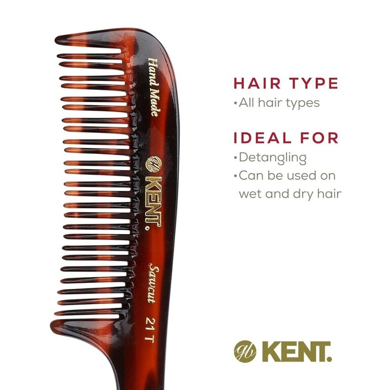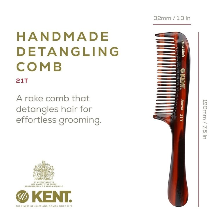 Le Kent 21T est un peigne démêlant artisanal fabriqué à la main en Angleterre. Avec ses 190 mm de longueur et son format large, il est conçu pour éliminer efficacement les nœuds et démêler les cheveux même les plus résistants. Grâce à ses dents de différentes tailles, spécialement agencées pour pénétrer la masse capillaire, il glisse dans les mèches et dénoue en douceur sans tirer ni casser le cheveu.