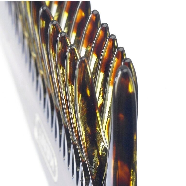 Fabriqué à partir de feuilles d’acétate de cellulose non moulé, un matériau flexible, solide et antistatique, le 21T offre une glisse fluide et confortable sur cheveux secs ou mouillés. Chaque dent est arrondie, polie et découpée à la main, garantissant un passage doux qui respecte le cuir chevelu et préserve la fibre capillaire.