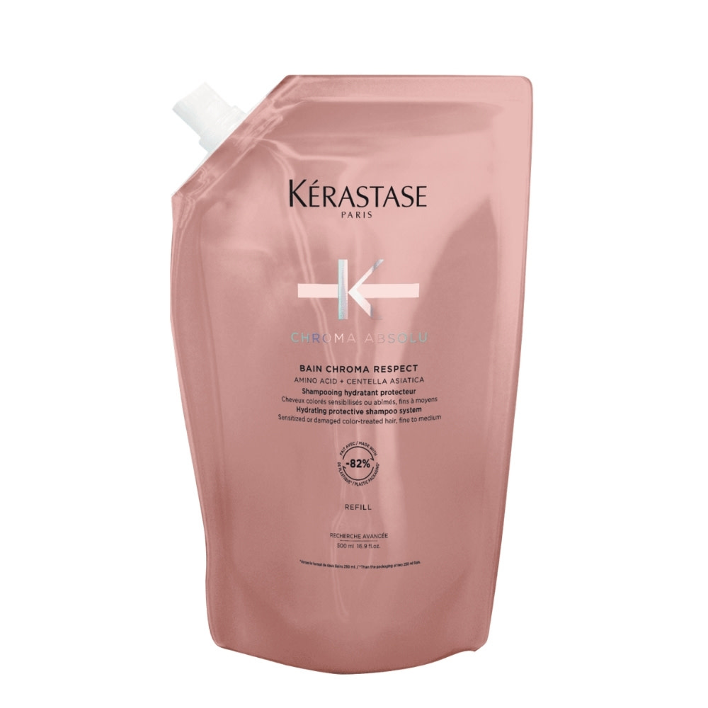 Le Bain Chroma Respect de Kérastase est la réponse haute performance pour les cheveux colorés fins à moyens, sensibilisés ou abîmés. Sa formule luxueuse traite la fibre en profondeur sans jamais l'alourdir, s'attaquant avec précision aux trois ennemis de l'éclat : la porosité, la casse et le délavage.
