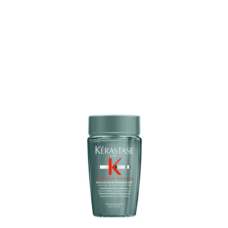 Le Bain de Masse Épaississant Genesis Homme de Kérastase est un shampoing booster d'épaisseur conçue pour répondre aux besoins spécifiques des cheveux masculins affaiblis, ayant tendance à s'affiner. Formulé avec des ingrédients actifs tels que la créatine et la racine de gingembre, ce shampoing offre une action purifiante et fortifiante en profondeur. En parallèle, il travaille à densifier la fibre capillaire, donnant ainsi l'impression d'une chevelure plus épaisse et plus dense. Grâce à sa texture généreuse, il forme une mousse onctueuse qui revitalise le cuir chevelu et laisse les cheveux propres, fortifiés et protégés, pour un look immédiatement plus volumineux avec 5 fois plus de corps.