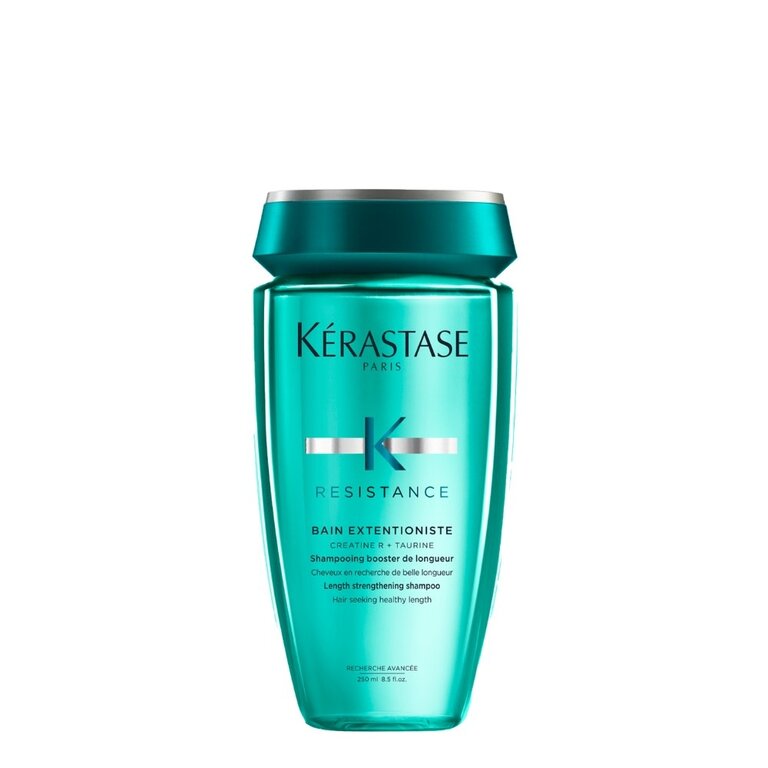 Le Bain Extentioniste Résistance de Kérastase est un shampoing booster de longueur conçu pour favoriser la croissance des cheveux longs tout en renforçant leur structure interne. Sa formule enrichie en créatine, en taurine et en céramides agit en synergie pour nourrir en profondeur la fibre capillaire, la renforcer et la protéger des cassures.