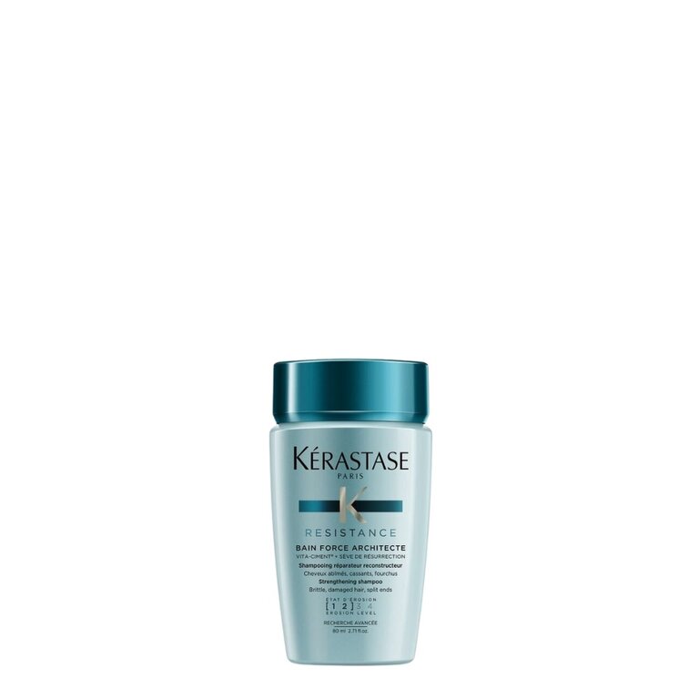 Le Bain Force Architecte Resistance de Kérastase est un shampoing réparateur et reconstructeur spécialement conçu pour venir en aide aux cheveux abîmés, cassants ou fourchus. Sa formule innovante, enrichie en sève de résurrection, en pro-kératine et en céramides, agit en profondeur pour réparer les fibres capillaires endommagées et renforcer leur structure.