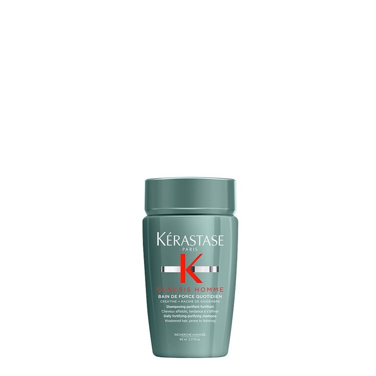 Le Bain de Force Quotidien Genesis Homme de Kérastase est un shampoing purifiant fortifiant conçu pour répondre aux besoins spécifiques des cheveux masculins affaiblis, ayant tendance à s'affiner. La créatine, reconnue pour ses propriétés fortifiantes, pénètre au cœur de la fibre capillaire pour la renforcer de l'intérieur. La racine de gingembre, quant à elle, apaise le cuir chevelu et stimule la microcirculation, favorisant ainsi une croissance saine des cheveux.