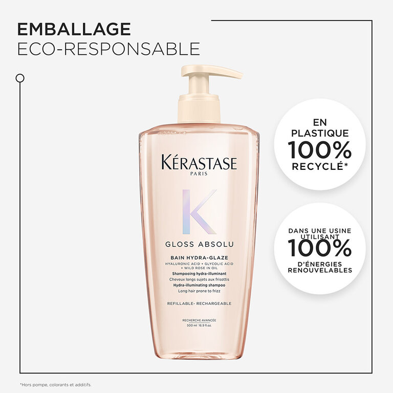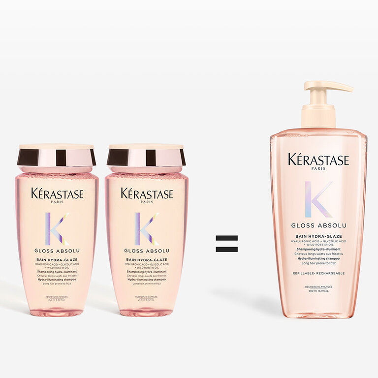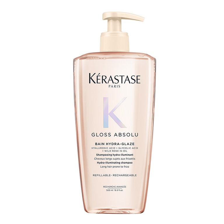 Le Bain Hydra-Glaze, issu de la collection Gloss Absolu par Kérastase est un shampoing hydra-illuminant conçu pour les cheveux longs sujets aux frisottis. L'association d'acide hyaluronique, d'acide glycolique et d'huile de rose sauvage offre une expérience de nettoyage luxueuse et assure des cheveux de rêve, rebondis et brillants.