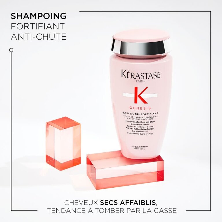 Le Bain Nutri-Fortifiant Genesis de Kérastase est un shampoing fortifiant anti-chute spécialement conçu pour les cheveux affaiblis, secs ou épais, sujets à la chute due à la casse.