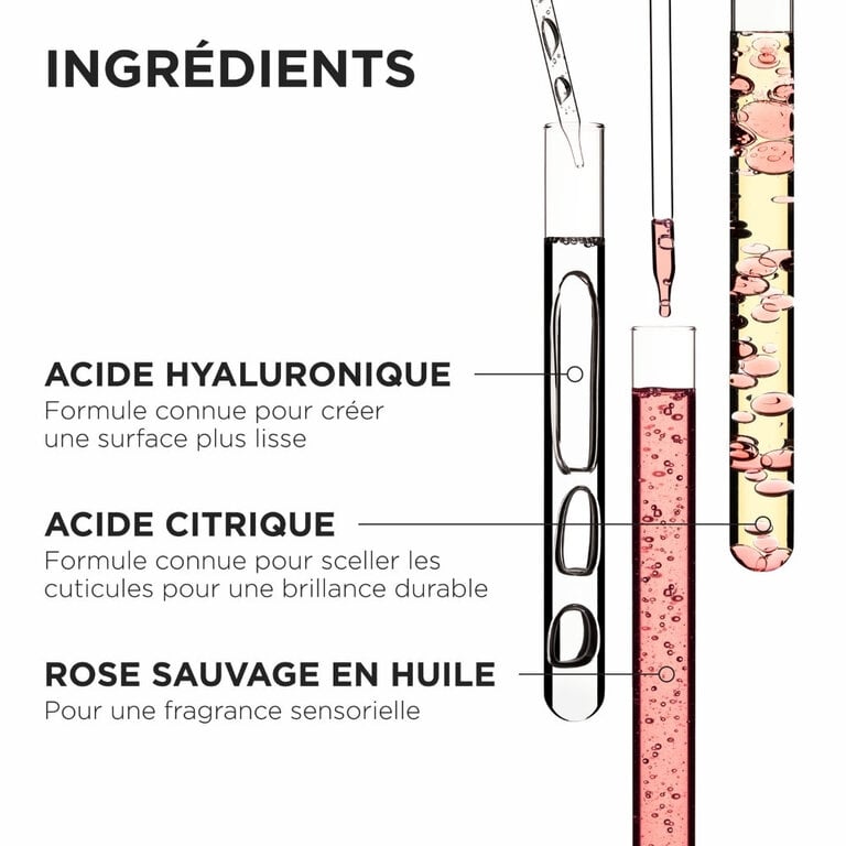 • Huile de rose sauvage : L'ingrédient vedette est reconnu pour sa capacité à apporter une brillance éclatante aux cheveux, leur donnant un aspect sain et lumineux. Son parfum subtil et féminin laisse une agréable sensation de fraîcheur sur les cheveux.