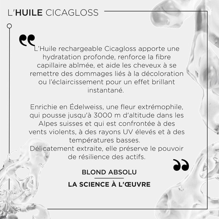 Découvrez le pouvoir raffiné de la fleur d'edelweiss avec le duo Cicagloss Blond Absolu par Kérastase, comprenant l'huile hydratante sans rinçage et sa recharge. Réputée pour ses propriétés antioxydantes, la fleur d'edelweiss lutte contre les agressions extérieures qui ternissent la couleur et abîment la fibre capillaire. Elle forme un véritable bouclier protecteur autour de chaque cheveu, les renforçant de l'intérieur et les laissant incroyablement doux et lumineux.
