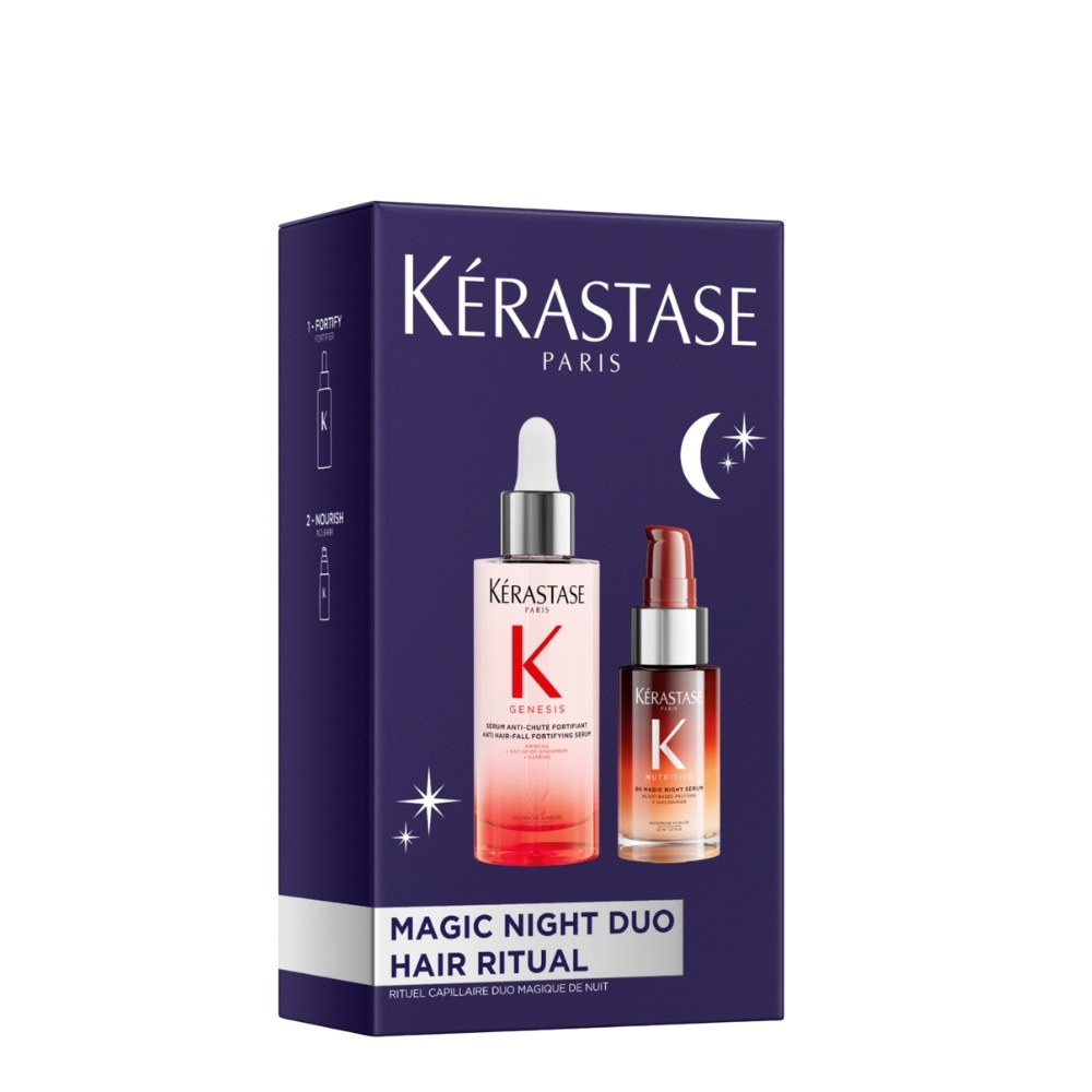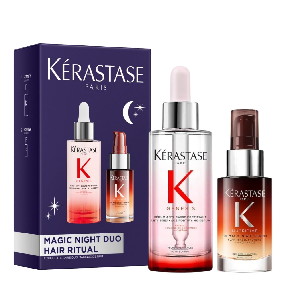 La chute de cheveux et la sécheresse des pointes ne sont plus une fatalité. Avec le duo magique de nuit "Magic Night Duo" de Kérastase, bénéficiez d'une cure intensive de huit heures. En associant la puissance anti-chute du sérum Genesis à la richesse nutritive du sérum de nuit 8h Nutritive, ce rituel agit sur tous les fronts : il renforce la fibre à la racine tout en infusant une hydratation profonde dans les longueurs. Réveillez-vous avec des cheveux plus résistants, prêts à affronter la journée avec éclat.