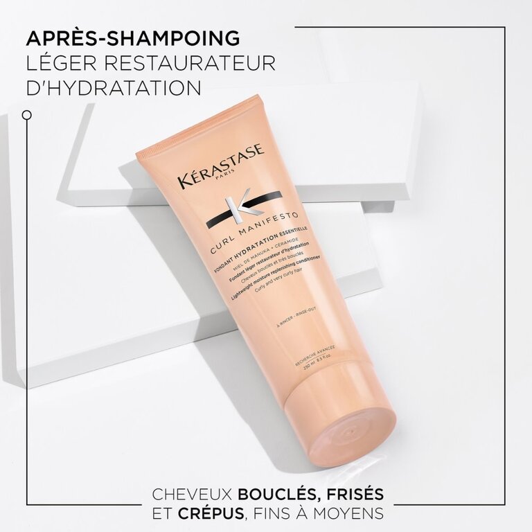 Le Fondant Hydratation Essentielle Curl Manifesto de Kérastase est un revitalisant léger restaurateur d'hydratation conçu pour répondre aux besoins spécifiques des cheveux bouclés, frisés et crépus. Sa formule légère et onctueuse pénètre en profondeur dans la fibre capillaire pour apporter une hydratation intense et durable.
