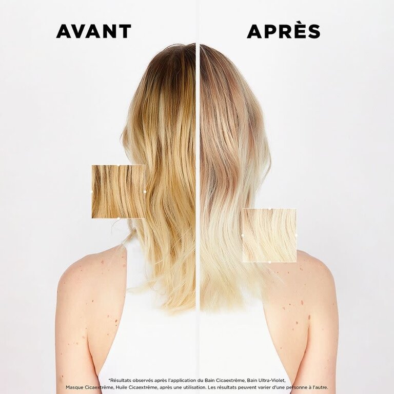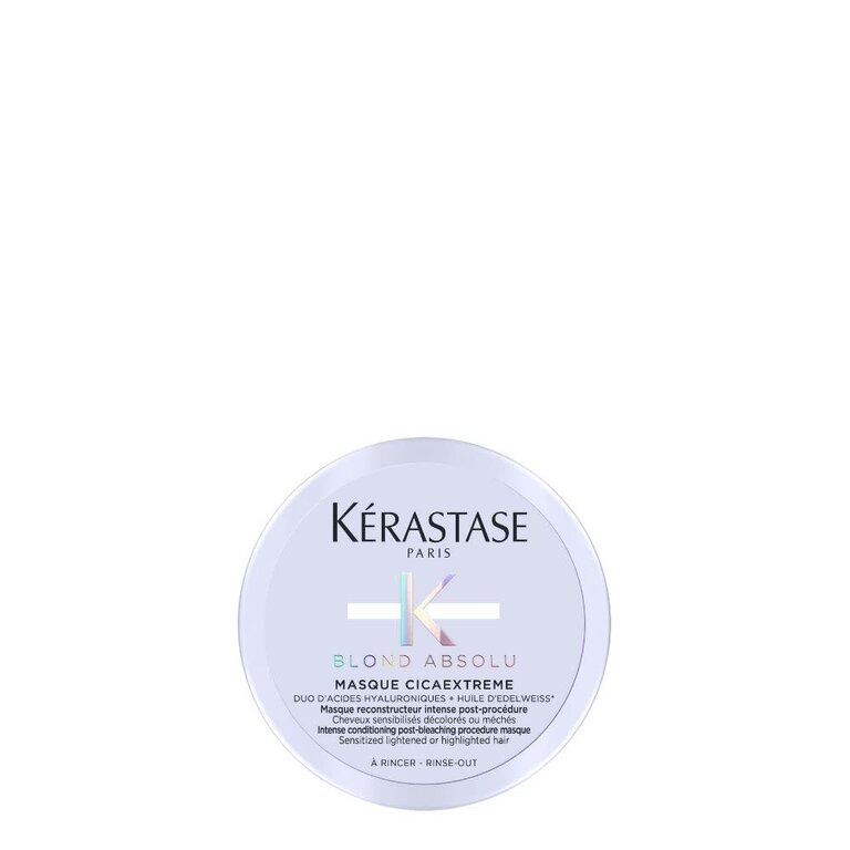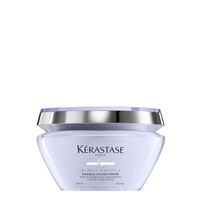Le masque Cicaextreme Blond Absolu de Kérastase est un traitement reconstructeur intense post-procédure spécialement conçue pour les cheveux blonds sensibilisés par les colorations et décolorations. Sa texture riche en gel-crème pénètre en profondeur dans la fibre capillaire pour la reconstruire et la renforcer de l'intérieur. Enrichi en un duo d'acides hyaluroniques et d'extrait de fleurs d'Edelweiss, ce masque revitalisant offre une hydratation intense et durable. Ce soin exceptionnel réduit significativement les pointes fourchues, jusqu'à 63%, et rend les cheveux 97% plus hydratés.