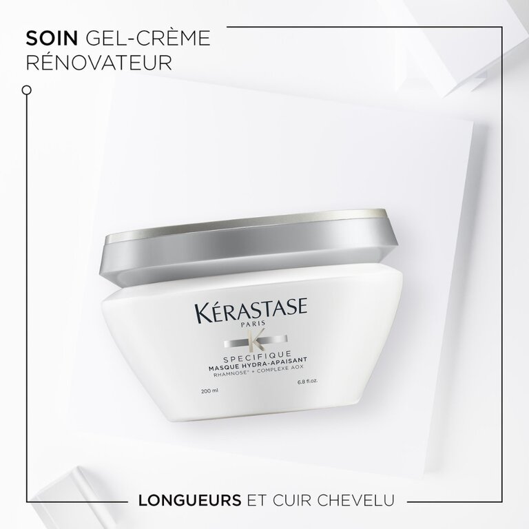 Le masque hydra-apaisant Specifique de Kérastase est un soin restructurant en gel-crème conçu pour apaiser et hydrater intensément les cuirs chevelus sensibles et les cheveux desséchés. Sa texture fondante pénètre en profondeur dans la fibre capillaire pour réparer les zones endommagées et restaurer l'équilibre hydrolipidique du cuir chevelu.
