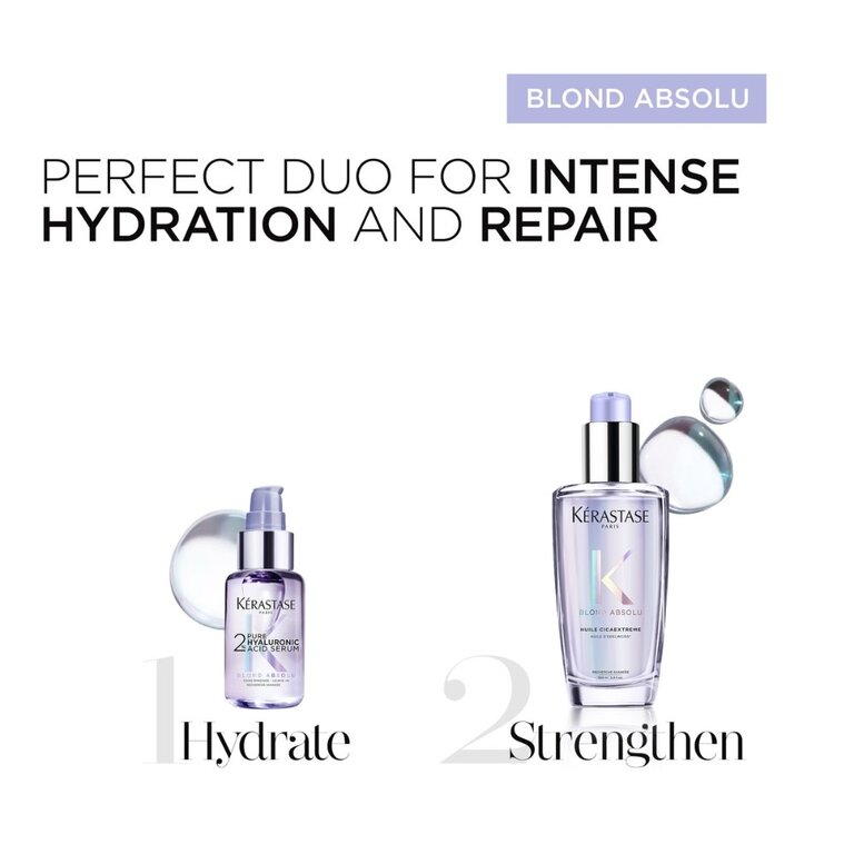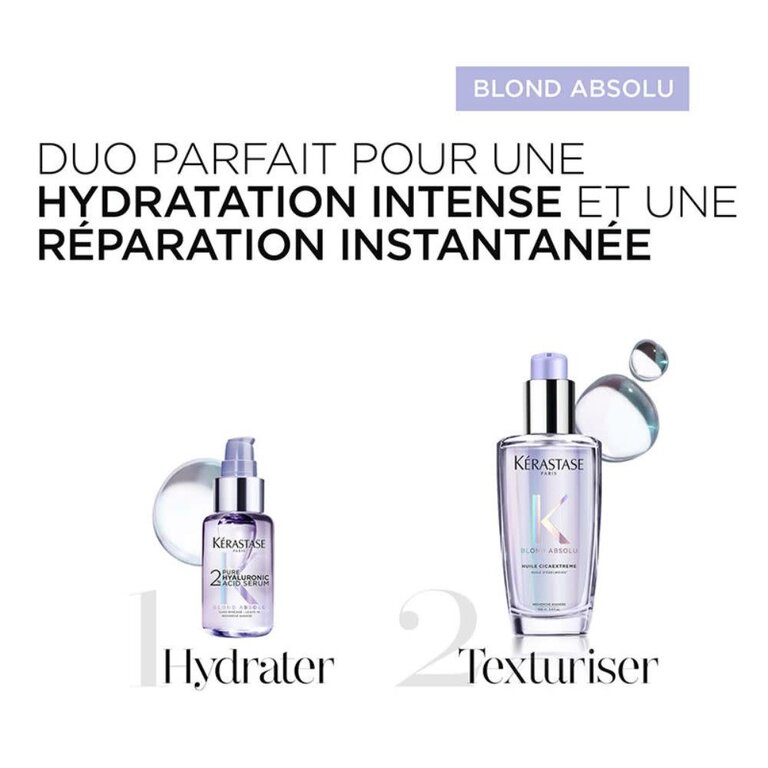 Inspiré des soins de la peau, le sérum réparateur hydratant 2% d'acide hyaluronique pure Blond Absolu de Kérastase est un soin spécifiquement conçu pour les cheveux blonds et le cuir chevelu en quête d'hydratation et de réparation suprême. Sa formule, enrichie d'une concentration élevée en acide hyaluronique macro et micro, agit en profondeur pour réparer les dommages causés par les colorations, les décolorations et les facteurs externes.