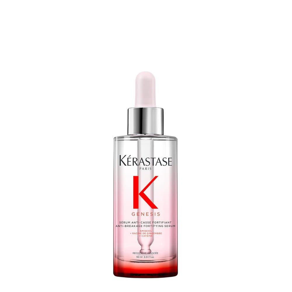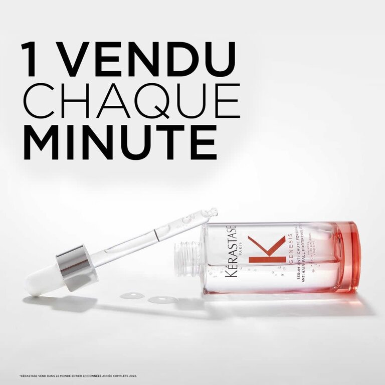 Le sérum anti-casse fortifiant Genesis de Kérastase est un soin quotidien conçu pour renforcer les cheveux affaiblis ayant tendance à tomber par la casse. Sa formule intensive, enrichie en Aminexil 1,5% et en cellules natives d'Edelweiss, agit en synergie pour revitaliser le cuir chevelu et fortifier la fibre capillaire. Jour après jour, il aide à réancrer plus solidement le follicule pileux, créant ainsi un environnement optimal pour une croissance saine. En parallèle, il apaise et renforce la barrière protectrice naturelle du cuir chevelu, le protégeant des dommages externes. Grâce à sa texture légère et non grasse, il pénètre rapidement dans la fibre capillaire, améliorant la résistance des cheveux et minimisant ainsi la chute due à la casse.