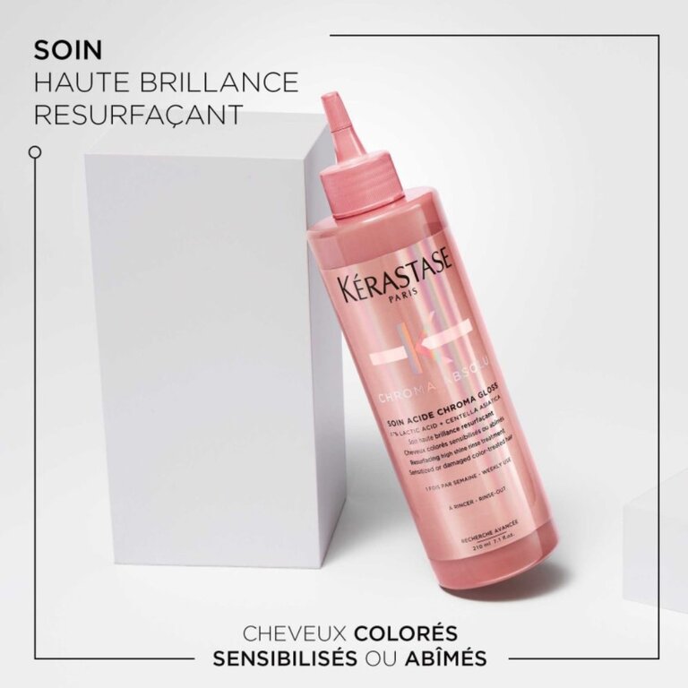 Le soin acide Chroma Gloss de Chroma Absolu par Kérastase est un traitement resurfaçant haute brillance conçu pour sublimer tous les types de cheveux colorés. Sa formule liquide unique se transforme en une crème blanche au contact de l'eau, pénétrant en profondeur dans la fibre capillaire pour une transformation visible et durable, grâce à une hydratation de plus de 94 %.