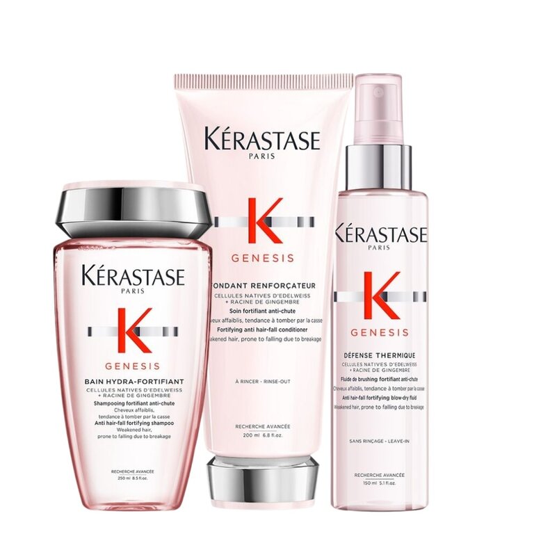 Évaluer Trio anti-chute cheveux fins à moyens Genesis avec Bain Hydra-Fortifiant, Fondant renforçateur & Fluide de brushing Défense Thermique (250ml/8.5oz, 200ml/6.8oz, 150ml/5.1oz)