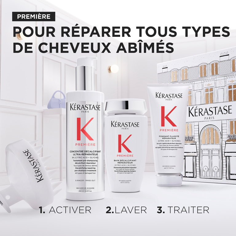 S'inscrireTrio décalcifiant réparateur "Première" avec Traitement pré-shampoing concentré, Bain réparateur et Fondant fluidité (2x250ml/8.5oz et 200ml/6.8oz)