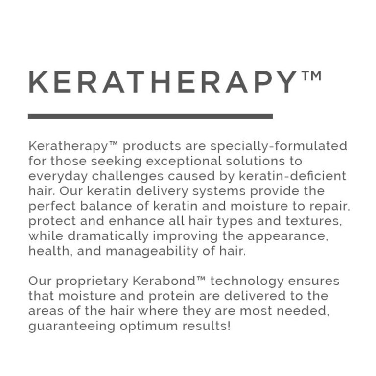 - Technologie Kerabond : exclusive à Keratherapy, cette technologie qui lie kératine, ingrédients botaniques, extraits et agents de conditionnement se distribue dans les zones du cheveu où ils sont le plus nécessaires. Le résultat est l'équilibre parfait de protéines et d'hydratation.