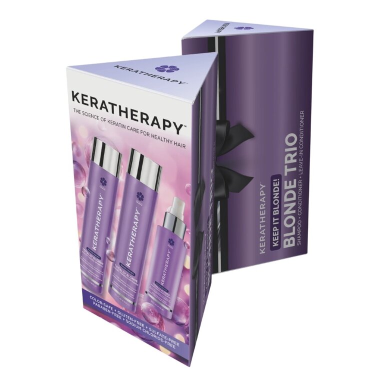 Réveillez votre blond parfait avec le trio "Keep It Blonde" de Keratherapy. Conçue spécifiquement pour les blonds exigeants, cette cure neutralisante combine des agents de soin hautement efficaces qui corrigent la couleur sans assécher la fibre. Elle assure un blond immaculé, une texture soyeuse et une maniabilité accrue.