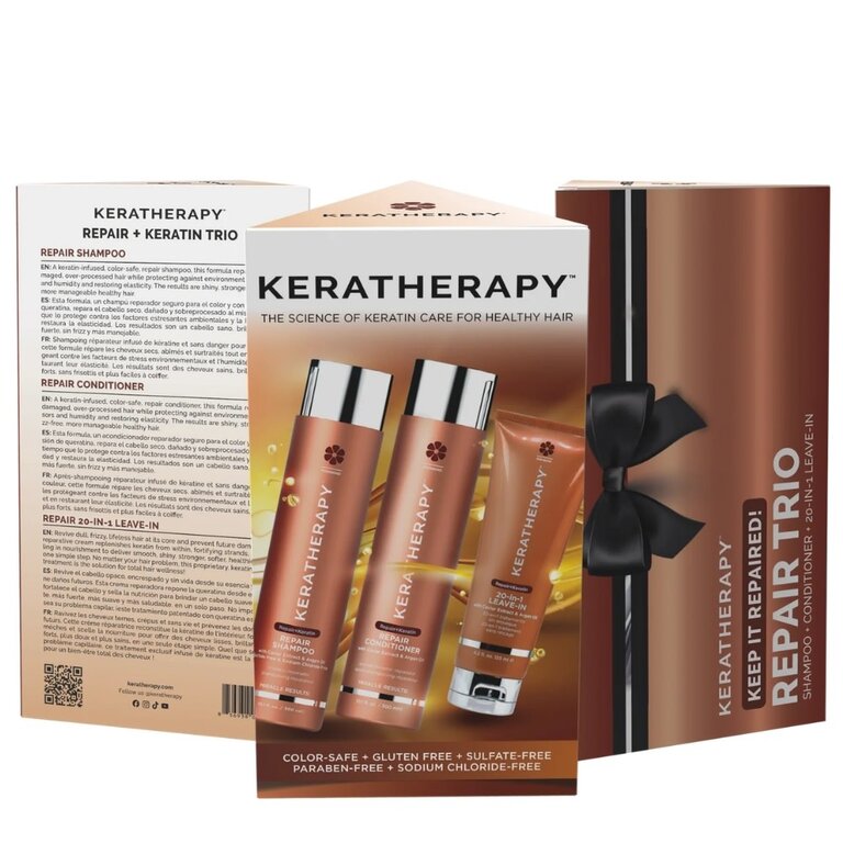 Inversez les signes de dommages grâce au trio réparateur "Keep It Repaired" de Keratherapy. Cette formule de reconstruction intensive imprègne les cheveux fragilisés et cassants de kératine et de nutriments essentiels. Elle scelle les pointes, renforce la fibre interne et restaure instantanément la souplesse, l'élasticité et la brillance de la chevelure.