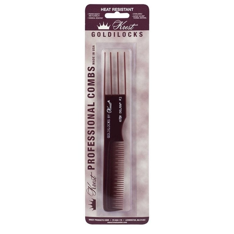 Le peigne à crêper "Lift Comb" avec broches en plastique No.3 de Krest Goldilocks, doté de dents de longeurs assorties qui glissent dans les cheveux sans les tirer et quatre broche de plastique s qui offre rigidité et flexibilité pour aider à soulever les cheveux. Ce peigne de 178mm/7 3/4" ajoute du volume en taquinant et en crêpant les cheveux.
