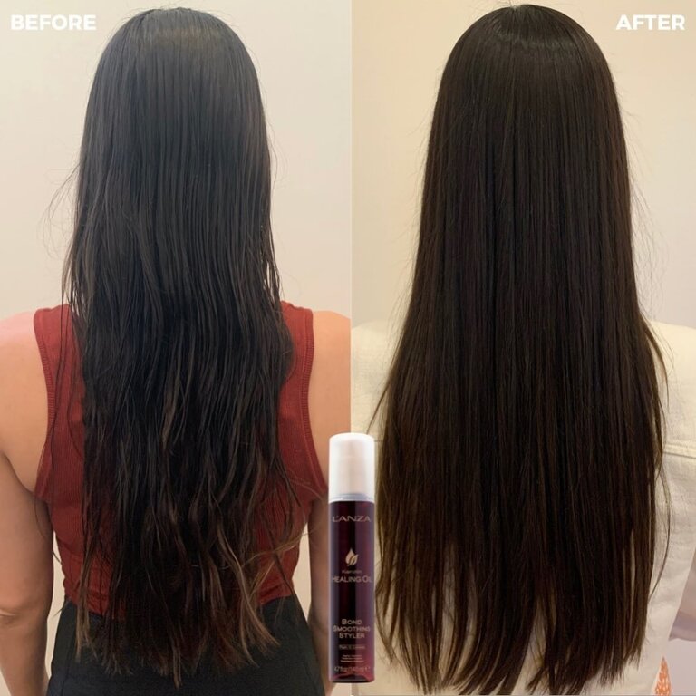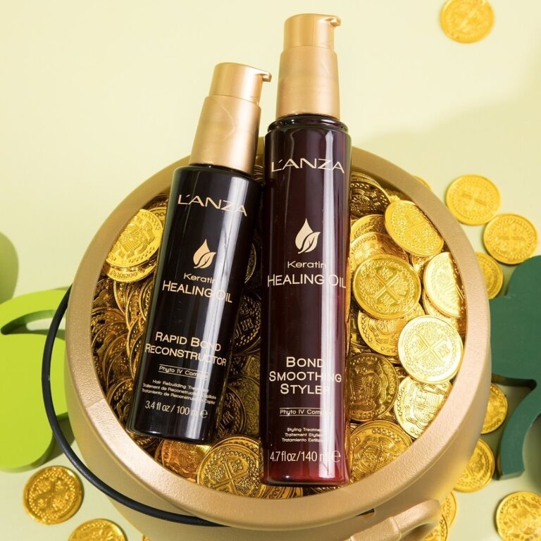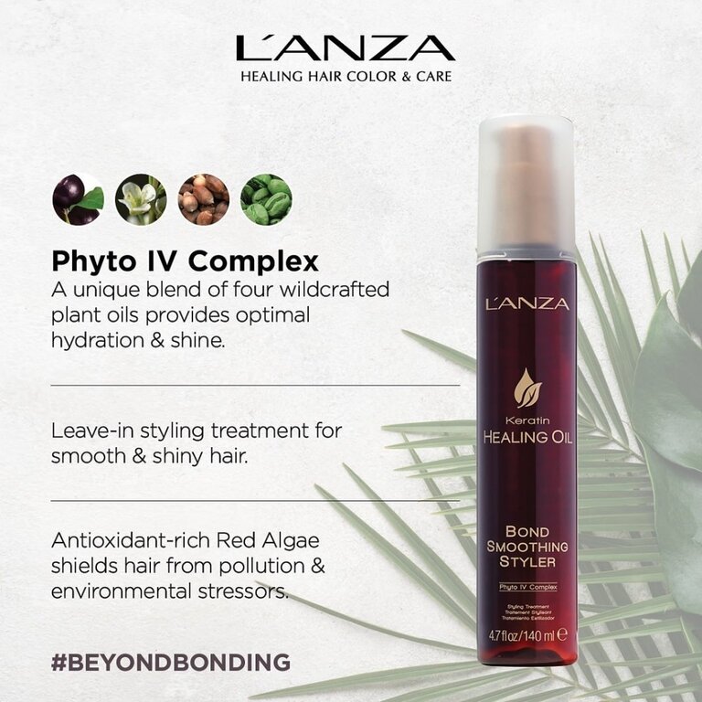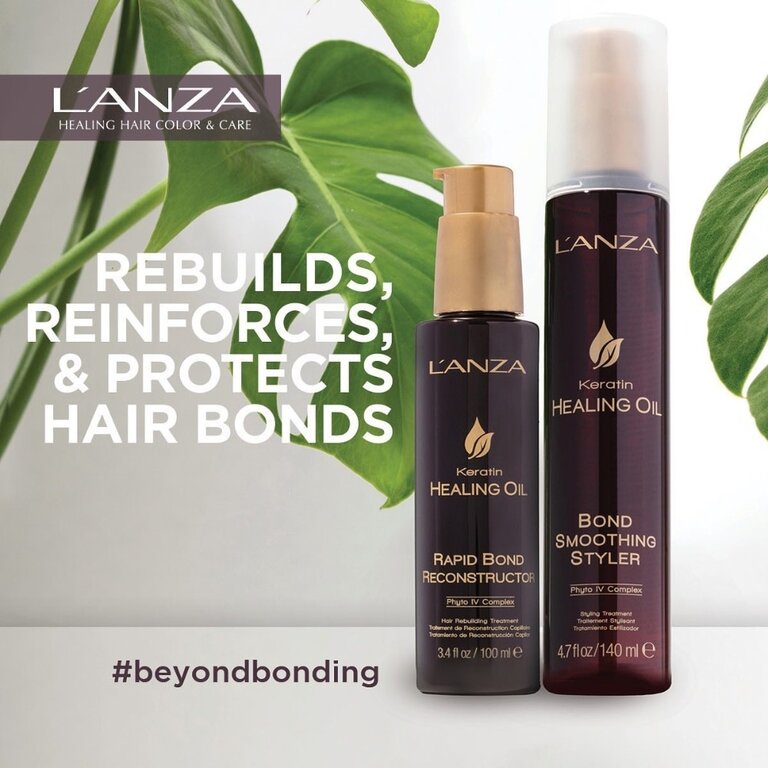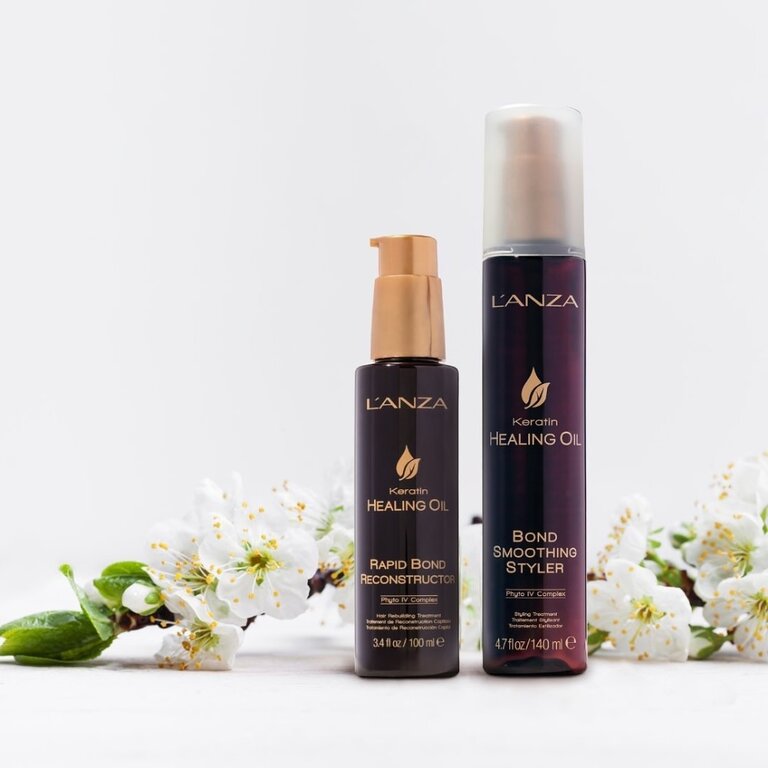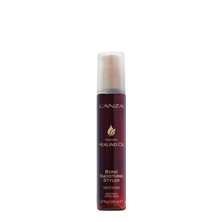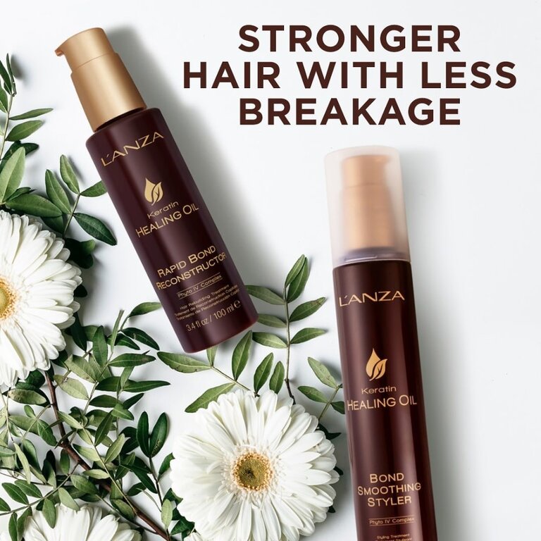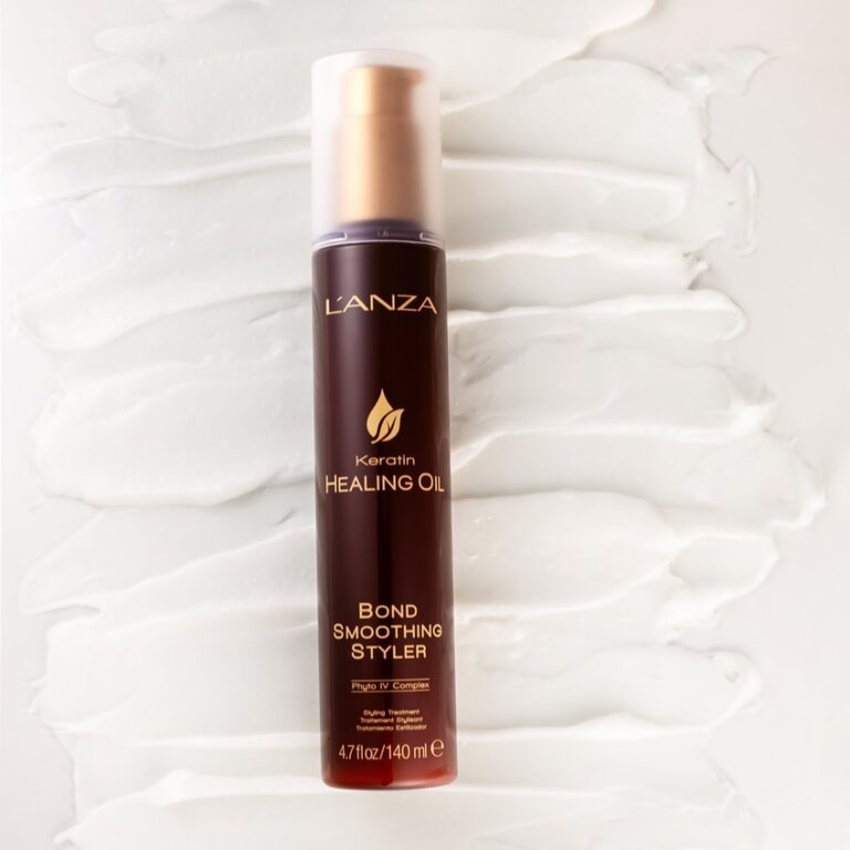 Le traitement coiffant à l'huile de kératine "Keratin Healing Oil Bond Smoothing Styler" de l'Anza lisse les mèches, reconstruit les liens brisés, régénère l'hydratation du cheveu et facilite le démêlage. Son utilisation est idéale pour le coiffage des cheveux endommagés.