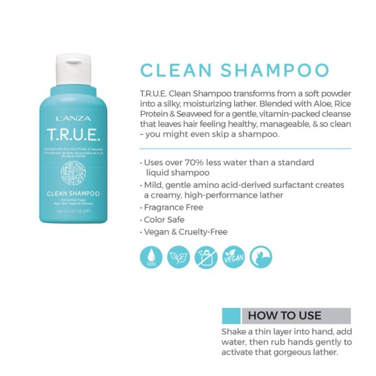 Le shampoing en poudre à rincer "T.R.U.E Clean" de l'Anza se transforme d'une poudre douce en une mousse soyeuse et hydratante. Mélangé avec de l'aloès, des protéines de riz et des algues pour un nettoyage doux et vitaminé qui laisse les cheveux sains, faciles à coiffer et si propres.