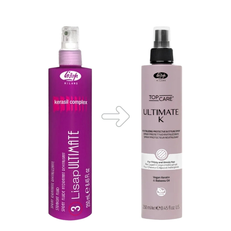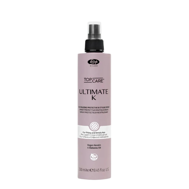 Le spray protecteur revitalisant "Ultimate K" de Lisap Milano marque l'évolution majeure du célèbre fluide lissant "Ultimate Plus Straight Fluid". Spécialement formulé pour les cheveux crépus et indisciplinés, ce soin hydratant, enrichi en kératine végétale et en huile de babassu, agit comme un véritable bouclier thermique.