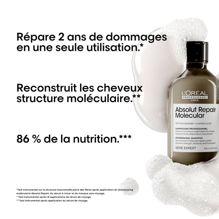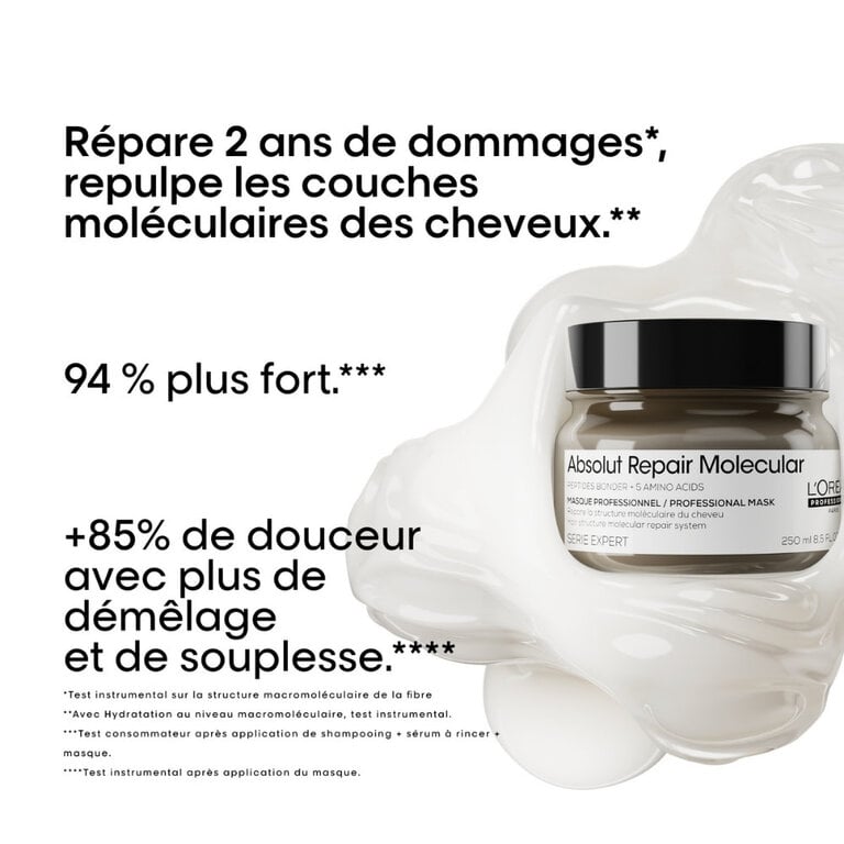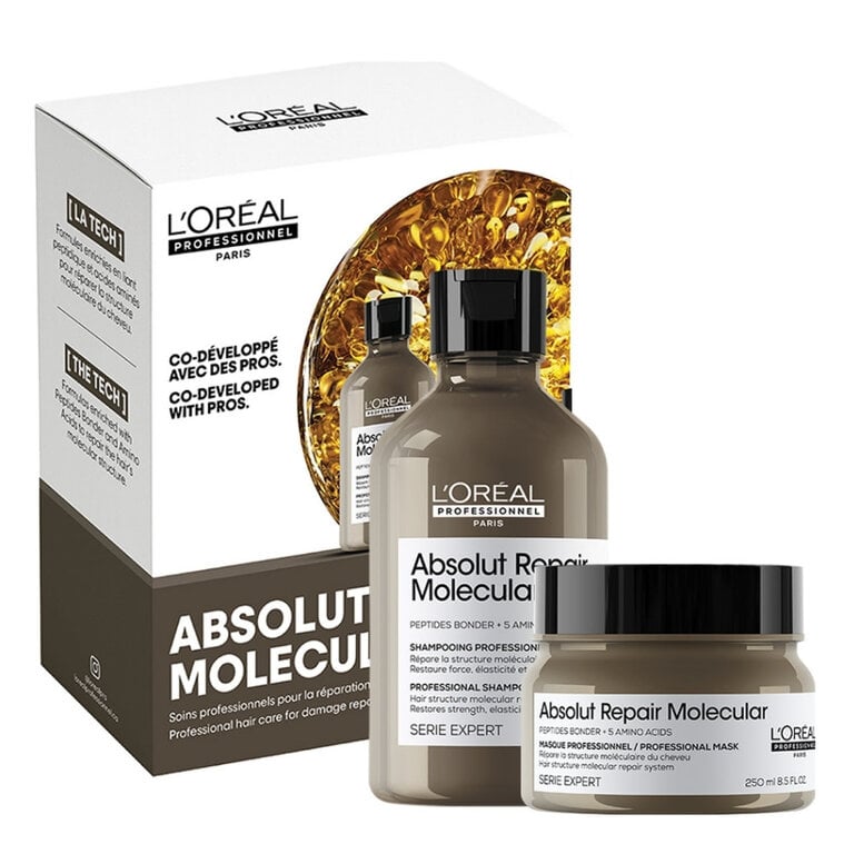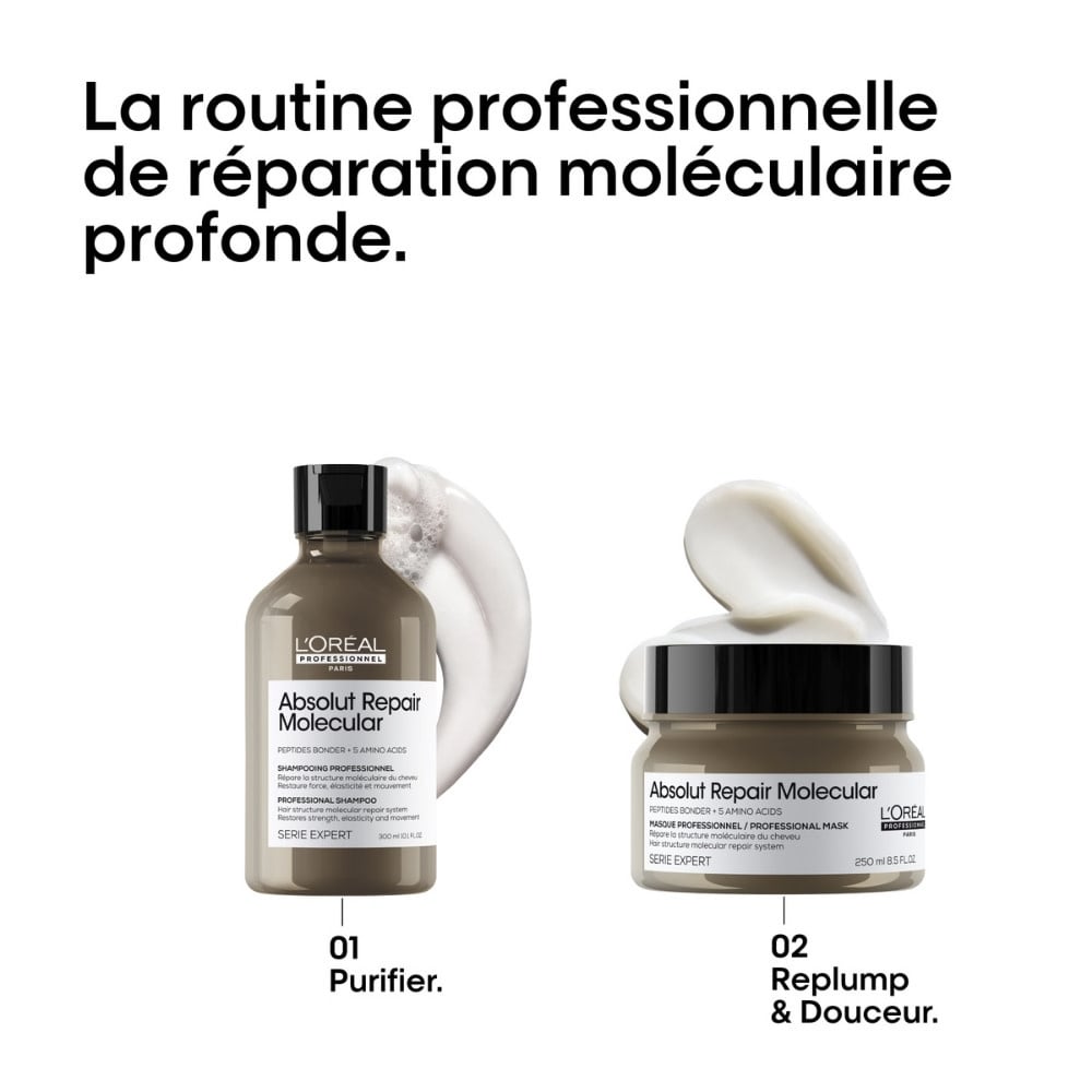 Découvrez la puissance de la réparation moléculaire avec le duo "Absolut Repair Molecular" de L'Oréal Professionnel. Cette routine révolutionnaire ne se contente pas de masquer les dommages, elle va au cœur du problème pour réparer la structure interne de vos cheveux. Offrez-leur une nouvelle vie, plus forte et plus saine, de l'intérieur.