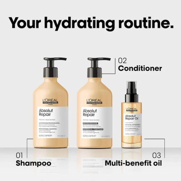 Plongez vos cheveux secs dans un océan d'hydratation avec le revitalisant restructurant instantané "Absolut Repair" de L'Oréal Professionnel. Sa formule enrichie en protéines de blé et de quinoa doré nourrit intensément et désaltère les cheveux en profondeur, pour une chevelure revitalisée et resplendissante de santé.