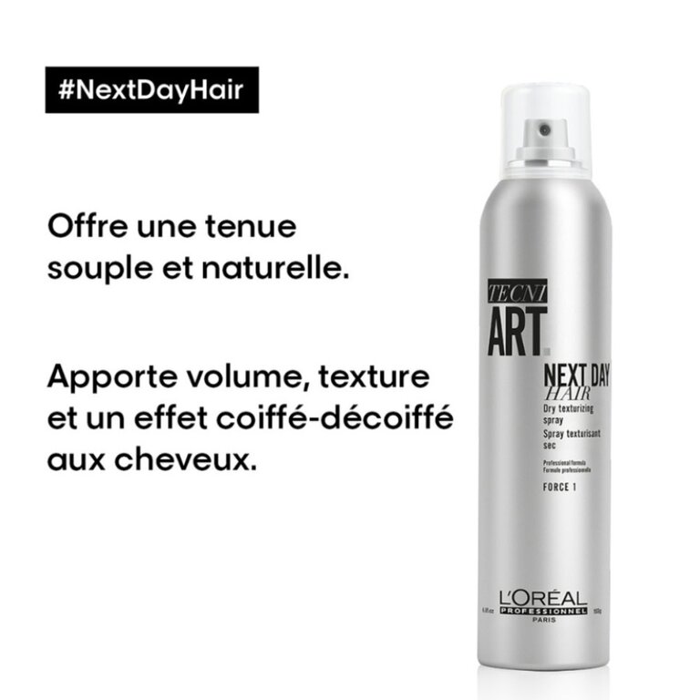 Le spray sec de finition "Next Day Hair" de Tecni.Art par L'Oréal Professionnel est un vaporisateur micro-propulsé qui transforme la chevelure pour un effet coiffé-décoiffé et décontracté au fini et au toucher naturels. Ce spray innovant offre l’équilibre parfait entre texture et tenue, vous permettant de créer sans effort une variété de styles, de la création de tresses et de chignons parfaitement imparfaits à l’ajout de texture aux mises en plis et à la diffusion des boucles. Son embout micro-propulsé assure une répartition uniforme du produit, ajoutant volume et dimension subtils pour un look plein de vie, jamais plat ou terne, qui incarnent le style décontracté moderne.