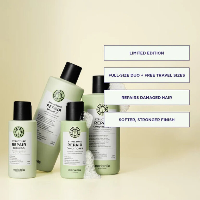 La réponse suédoise aux cheveux en quête de réparation. L'ensemble "Structure Repair" de Maria Nila mobilise la puissance des algues et de la protéine de blé pour stabiliser la fibre et réduire les fourches. Cette routine professionnelle agit sans alourdir, redonnant de l'élasticité et de la brillance aux chevelures les plus fragiles. L'essentiel du soin scandinave : une efficacité visible et une protection durable.