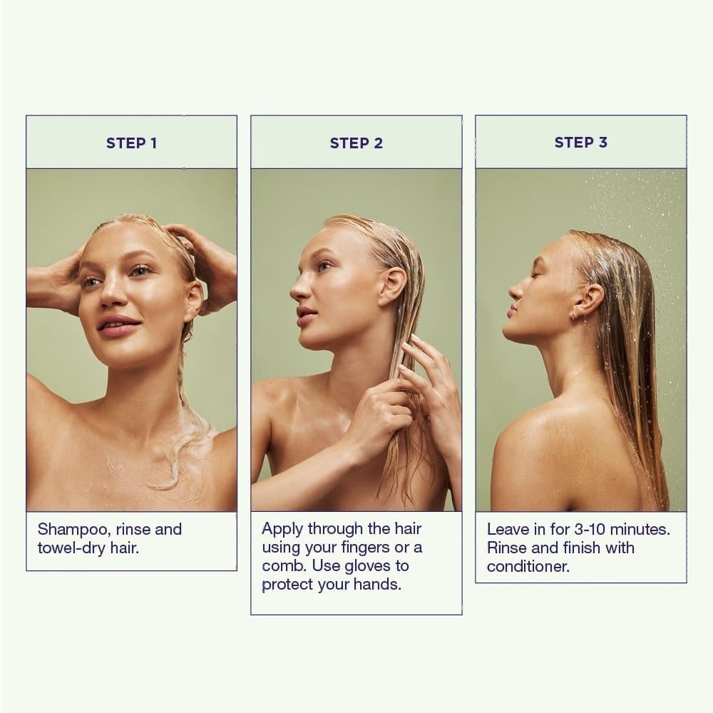 Mettez des gants pour protéger vos mains. Appliquez ensuite le masque de couleur uniformément sur toute votre chevelure, en utilisant vos doigts ou un peigne. Laissez agir le produit de 3 à 10 minutes, selon l'intensité désirée. Rincez abondamment à l'eau claire pour éliminer tout surplus de couleur.