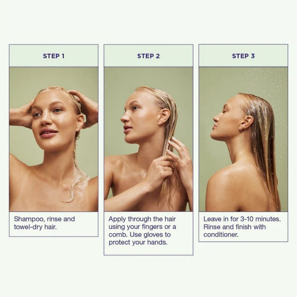 Mettez des gants pour protéger vos mains. Appliquez ensuite le masque de couleur uniformément sur toute votre chevelure, en utilisant vos doigts ou un peigne. Laissez agir le produit de 3 à 10 minutes, selon l'intensité désirée. Rincez abondamment à l'eau claire pour éliminer tout surplus de couleur.