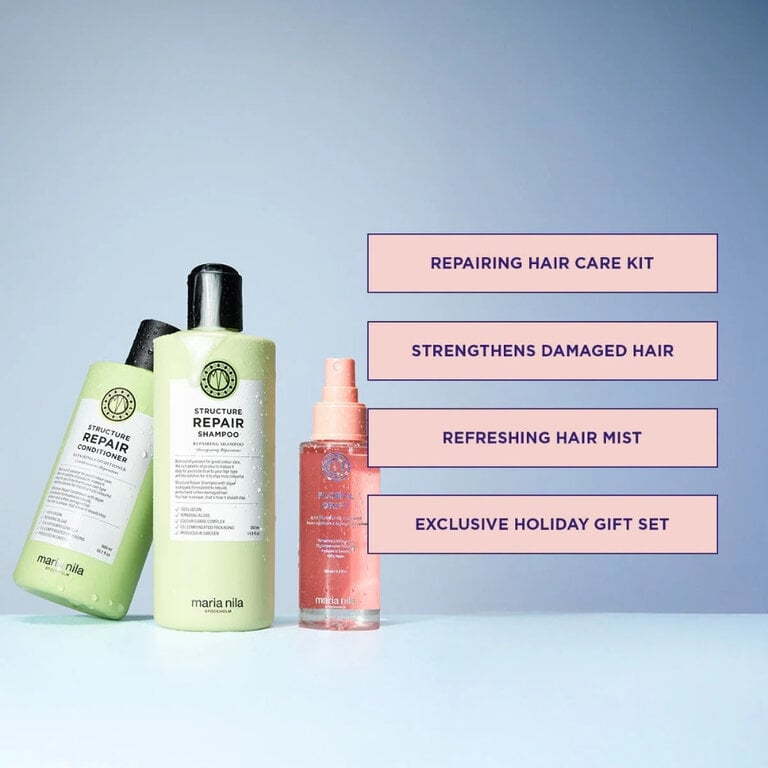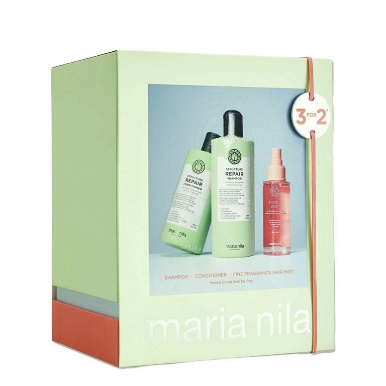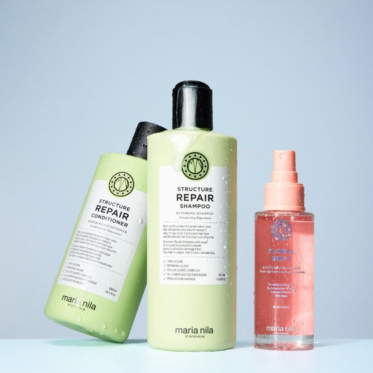 Régénérez vos cheveux abîmés grâce au trio réparateur "Structure Repair" de Maria Nila, conçu sur mesure pour les cheveux fragiles, secs ou traités chimiquement. Grâce à la puissance des extraits d'algues et de la protéine de blé, ce rituel beauté aide à renforcer la structure interne, à réparer les pointes fourchues et à hydrater en profondeur la fibre capillaire.