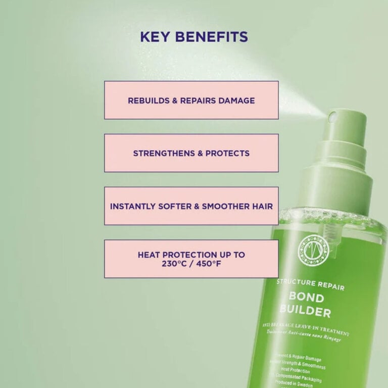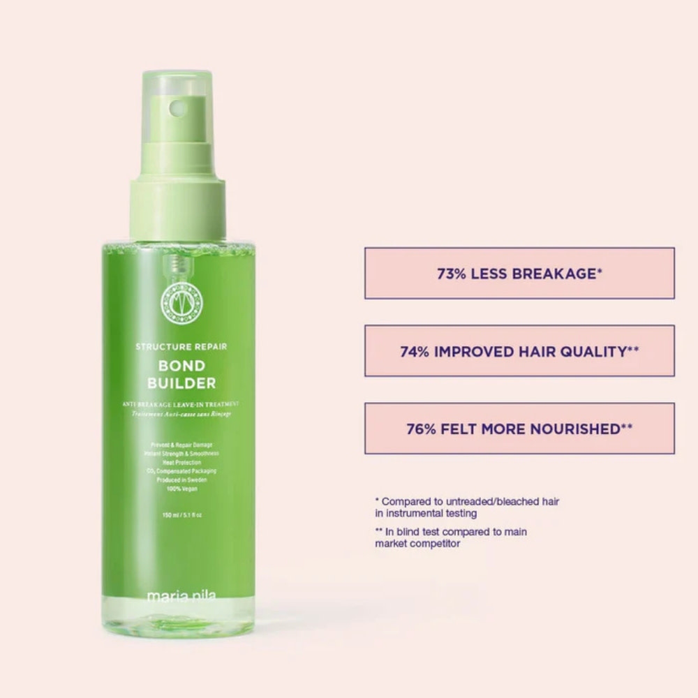 Stoppez durablement la casse avec le traitement sans rinçage "Bond Builder" de Maria Nila. Grâce à sa technologie de reconstruction de liaisons multi-bénéfices, ce soin anti-casse restaure instantanément les ponts disulfures afin de redonner force et élasticité au cœur du cortex.