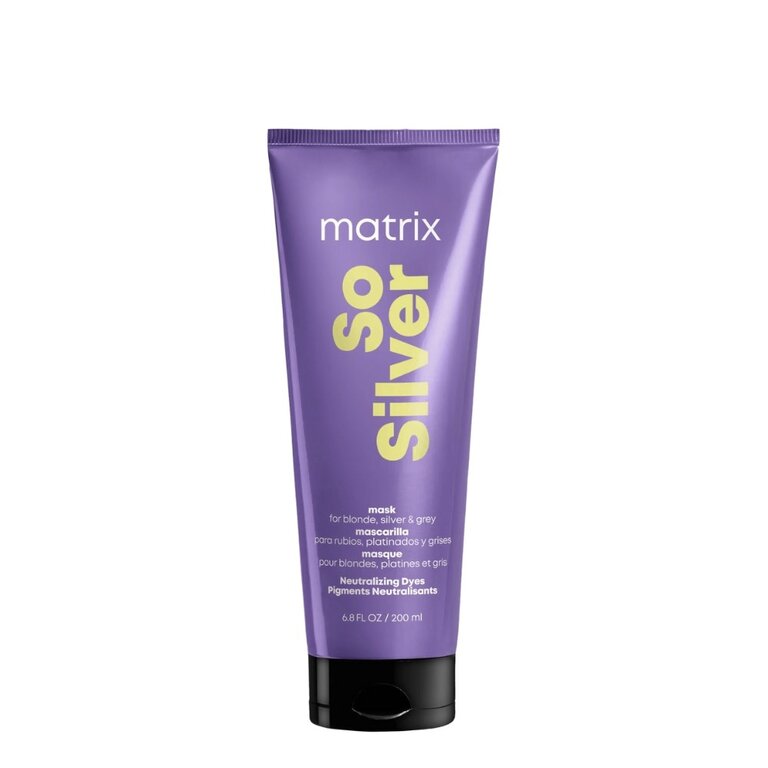 Le masque neutralisant "So Silver" de Matrix neutralise les reflets jaunes indésirables qui se retrouvent dans les cheveux blonds et transforme le gris en un argent époustouflant. Il laisse les cheveux doux, soyeux et facile à coiffer.
