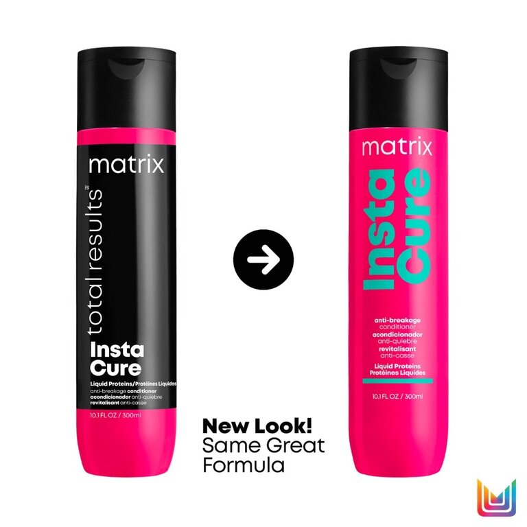 Le revitalisant anti-casse à protéines liquides "Instacure" de Matrix nourrit, répare et renforce les cheveux secs, abîmés et cassants.