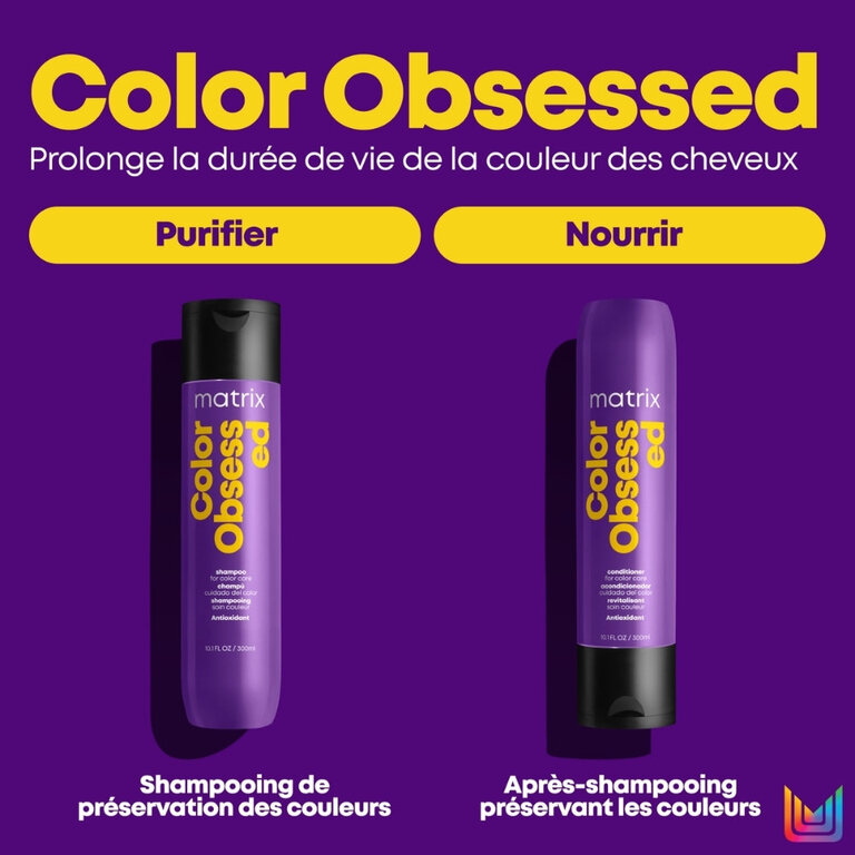 Le revitalisant "Color Obsessed" de Matrix protège contre le ternissement et prolonge la durée de l'éclat de la couleur. Rempli d'antioxydants, il protège contre les dommages environnementaux tout en conservant la couleur vibrante.