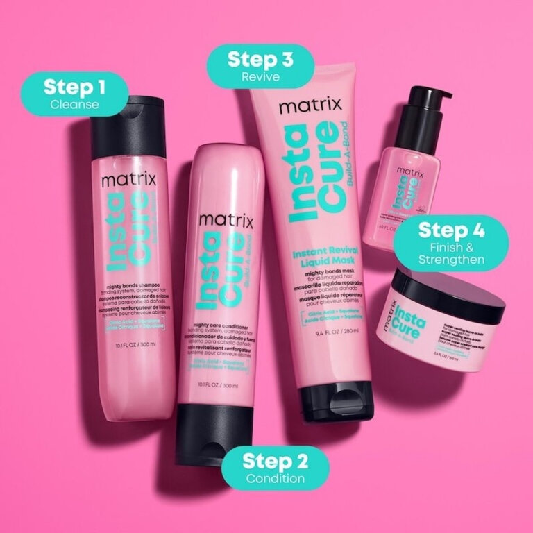 Poursuivre avec le revitalisant ou le masque "Instacure Build-A-Bond" de Matrix.