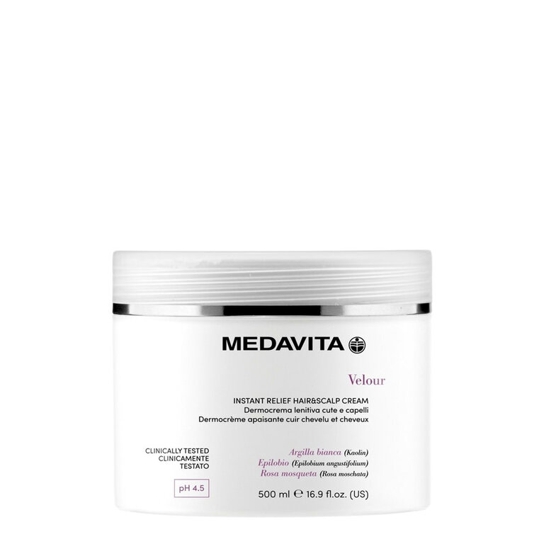 La dermocrème apaisante Velour "Instant Relief Hair&Scalp Cream" pré-shampoing de Medavita purifie, assainit et prépare le cuir chevelu à recevoir les bienfaits des principes actifs contenus dans les soins suivants. Grâce à sa formule enrichie à l’huile de Rose musquée, au Kaolin, à l’extrait d’Épilobe, au Panthénol et à l’huile de graines de Chia, la Dermocrème est le nouveau geste de purification et de nutrition pour le cuir chevelu et les longueurs. Le cuir chevelu est apaisé et les longueurs sont assouplies, démêlées, hydratées et infusées de principes actifs protecteurs et nourrissants. La gamme Velour de Medavita offre une routine calmante et apaisante conçu pour rétablir l’équilibre cutané et atténuer les rougeurs, les démangeaisons et la desquamation.
